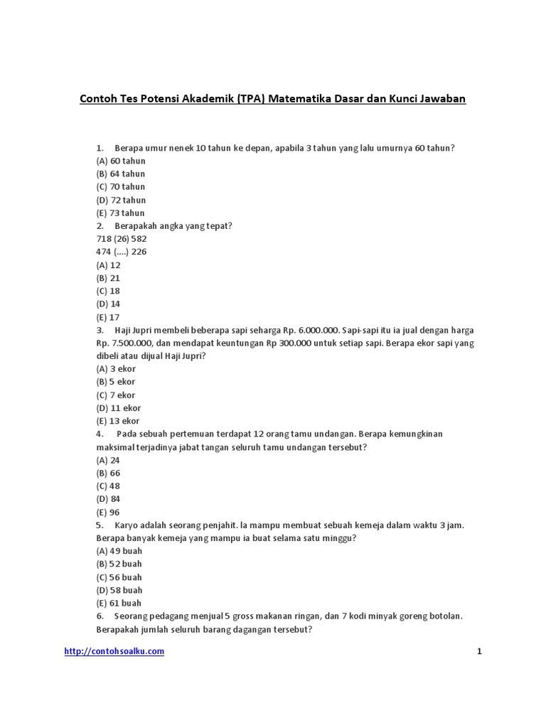 Pembahasan soal tes potensi akademik (tpa) matematika dasar alhamdulillah kali ini saya akan update postingan lagi. saya akan membagikan contoh tes potensi akademik (tpa) matematika dasar (1). dan jangan lupa juga untuk membaca postingan saya sebelumnya tentang pembahasan soal kemampuan penalaran deduktif tes potensi akademik (tpa). Tahapan seleksi akademik ini akan diumumkan pada tanggal 19 mei 2019. tes akademik polri mencakup 3 bidang mata pelajaran yakni, 1) pengetahuan umum atau muatan lokal 2) matematika 3) bahasa indonesia. a) bentuk ujian dilaksanakan dengan tertulis, dimana soal dan jawaban disampaikan dengan tertulis. Tespotensiakademik (tpa) kode soal : 103 free download i. tes kemampuan verbal bagian 1 : padanan kata ( sinonim) petunjuk : carilah padanan kata (sinonim) yang tepat dari kata berikut ini 1. virtual a. maya b. impian c. nyata d. virgin e. hiponema 2. semiotika a. ilmu tentang tanda b. ilmu seni c. ilmu bahasa d. bahasa simbol. Soal tpa bappenas dan kunci jawaban tes potensi akademik atau tpa adalah sebuah tes yang bertujuan untuk mengetahui bakat dan kemampuan seseorang di bidang keilmuan atau akademis. karenanya tpa ini sering dihubungkan dengan kecerdasan seseorang. tes potensi akademik identik dengan tes gre atau graduate record examination sebagai standar internasional.